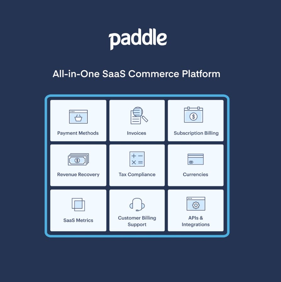 Paddle is an All-in-One SaaS Commerce Platform. It’s a solution favored by companies that want to have all the complexities of selling software managed by one platform. All Paddle customers get access to the full platform of features, including payment gateway (including different payment methods), merchant account, subscription management, currencies, revenue recovery, reconciliation, tax, and more.