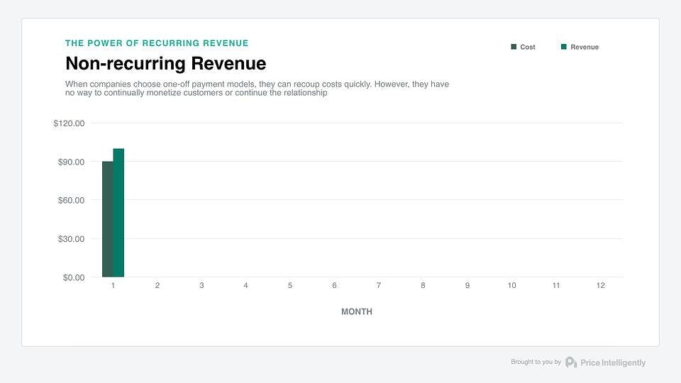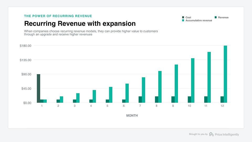 The secret (and beauty) isn't in the recurring piece necessarily, but in the relationship building, which is accounted for through good ol' expansionary revenue. If you're able to get into that particular account and essentially upsell through added value (either through more usage of your product, add-ons, etc.) you can not only recover your customer acquisition cost (CAC) quicker, but you can maximize profits, as well.