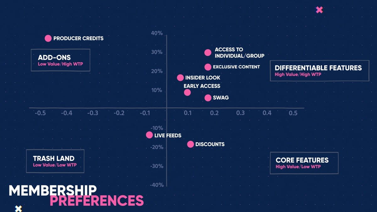 Right. Um, and what you're seeing here, and this is a value major, it's basically based on what preferences are inside a membership. You have things like, you know, discounts and live feeds. Those aren't something that are highly, highly valued. You can still provide those things, but things like early access swag, it's not that you have to give the swag away for free, it's just access to swag. Like Drew, what he could do with his CK is basically just like, Hey, here's a Facebook group that you get access to. I know Hustle has done that. Um, with trends. Trends. Yeah. I think they're also called trends now that I realize that Yeah, you're right. It reminds me of like Phish, you know? Right. Like the Grateful Dead, right. Yeah. People just travel around, travel around Grateful Dead and Phish probably have the biggest opportunity to have a subscription of some story.