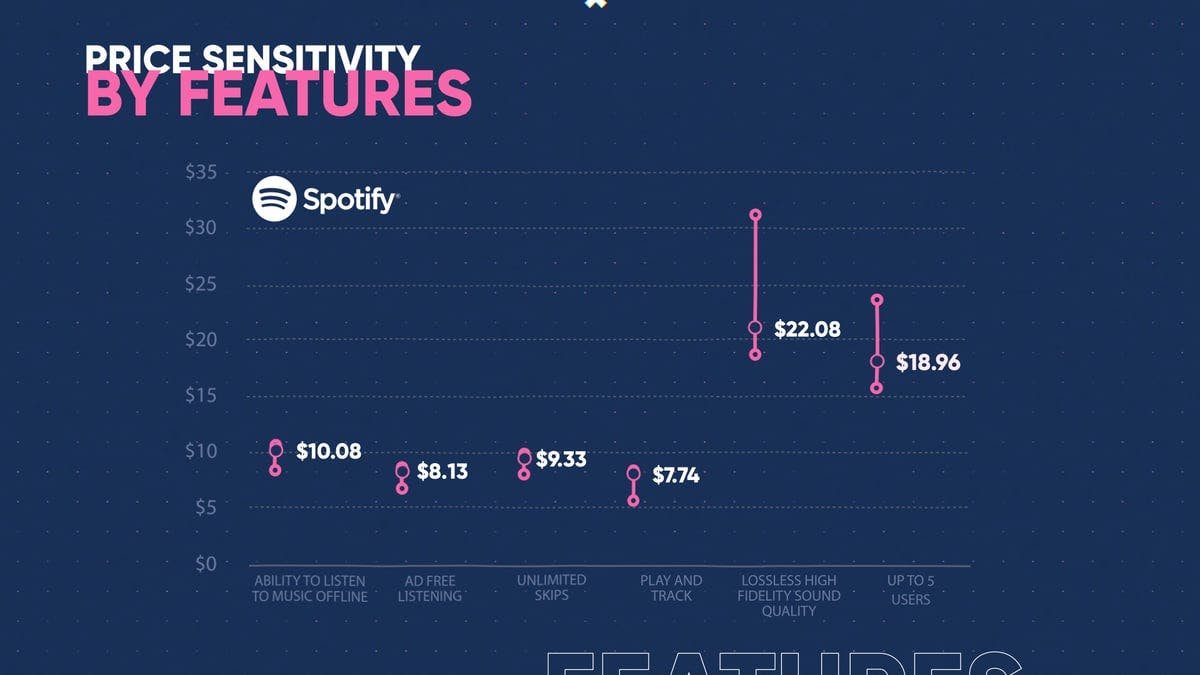And now I end up seeing Lee's music and it's all like musicals and the Greatest Showman and stuff like that coming through in my stream. And um, definitely kind of weird juxtaposition with gangster app. But uh, there you go. Yeah. I think that they're currently priced to 15. We saw, uh, an additional premium of four more dollars that people are willing to pay there. Yeah. And I think that's one of those things that's really interesting cuz like, and don't, don't come at me Spotify. So Peter Fado, myself and I think Jenny and one other person. Oh, that's amazing. All use the same family plan paying 15, we pay about 25 for it. Right. Which is the, like the upper end of this particular range. I think the range actually goes up over 30 here. Wow. I think the big takeaway for any business out there is bundling analysis is so crucial, so much in b2b but also in like two-sided marketplaces, which is kind of what Spotify has.