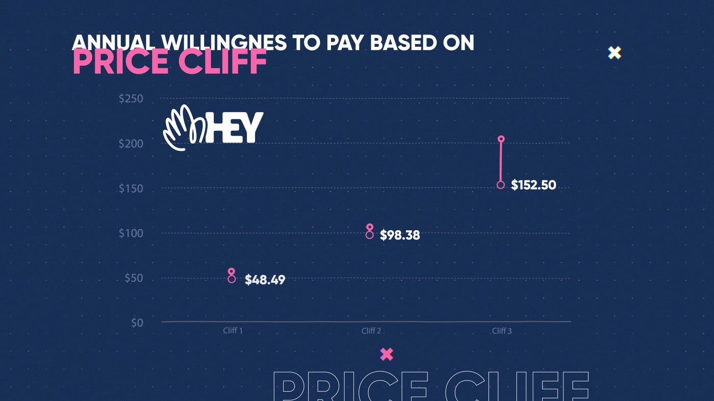 Mm-hmm <affirmative>, they've basically honed in on this dollar amount that not only gets people through the door and testing it, but also keeps it really, really simple for conversion. We've basically tested willingness to pay for people who were willing to pay for something like email. These are people who actually resonate with some of the value propositions of hey.com and we basically looked at the price Cliffs. Now Price Cliffs, for those of you who don't know, it's basically when you measure an elasticity curve, what are the natural little cliffs of different types of users that exist? And these typically are kind of the tiers that you should focus on. But in the case of hey.com, these are the different price points that they basically could put this mono price for their product. And what we found is that the Cliff won was right around $50. Mm-hmm.