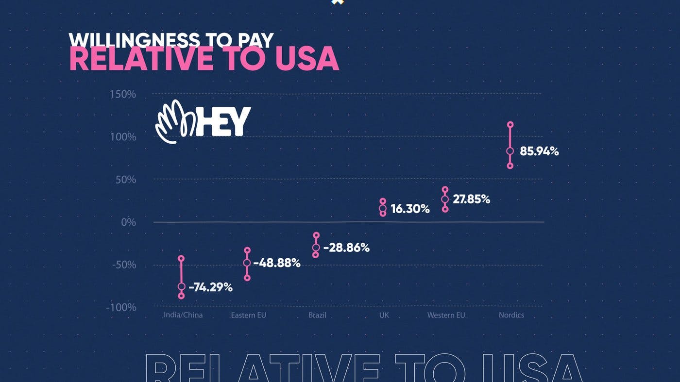 According to our data, some markets, such as India, Eastern Europe, and Brazil, are less willing to pay than the US, while others, like Nordic countries, are willing to pay over 85% more. Adjusting to these differences is crucial for increasing conversions in these regions. Additionally, some countries prioritize privacy more than others, which affects their willingness to pay for Hey's value proposition. Overall, localizing your pricing is an easy way to increase revenue and prepare for more aggressive monetization projects in the future. This will also ensure that your billing system is set up and internal pricing politics are figured out.
