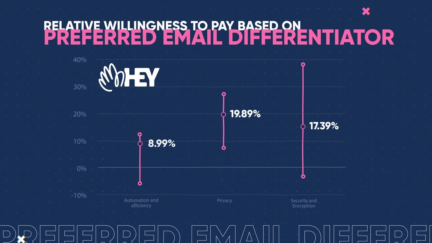 Yeah. Did improve willingness to pay by about 10% on a median basis. Things like privacy, security and encryption. These things that hey.com are leading with boosted willingness to pay or at least correlated with about a 20% boost from median perspective to higher willingness to pay and also the highest ranges, right? So almost getting up to 30, 40% increased willingness to pay from that particular group versus kind of the median folks who would even be willing to purchase some sort of email product. Yeah. So it's probably pretty obvious at this point we've pretty much beaten this to death. We have beat this to death. Yes, yes, yes, yes, yes. But what you can take away for your business is look for the value proposition that has the highest willingness to pay. It should be the H one on your website. Mm-hmm. <affirmative>, it should be what's emphasized throughout the copy.