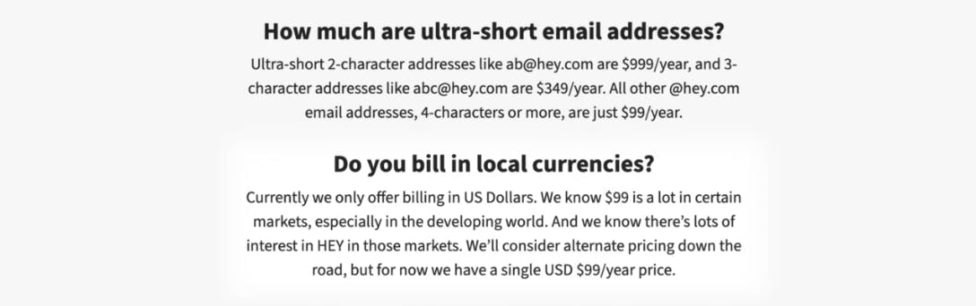 Simplicity is the other big thing that I take away from this. Mm-hmm. <affirmative>, there's no tier here. There are a couple of little things here and there, but it's just simple. A hundred bucks a year. But the other thing is, is the rest of the page is just q and a. Totally. Right? Yeah. Do they bill in multiple currencies? No. How much are ultra short email addresses? This is the one differentiator you have. If you want two character like PC@hey.com, which Jason dhh, I would pay for that. I also do really like in the simplicity here, how they answer other objections. Do they offer these things? They have no qualms about being like, no we don't. Right? Or Hey, we are going to, but not right now. Or Hey, what happens if I don't wanna use the product anymore? You keep your email address forever. And in addition to that, we will forward any emails that come to your hey.com to whatever other email you want. You