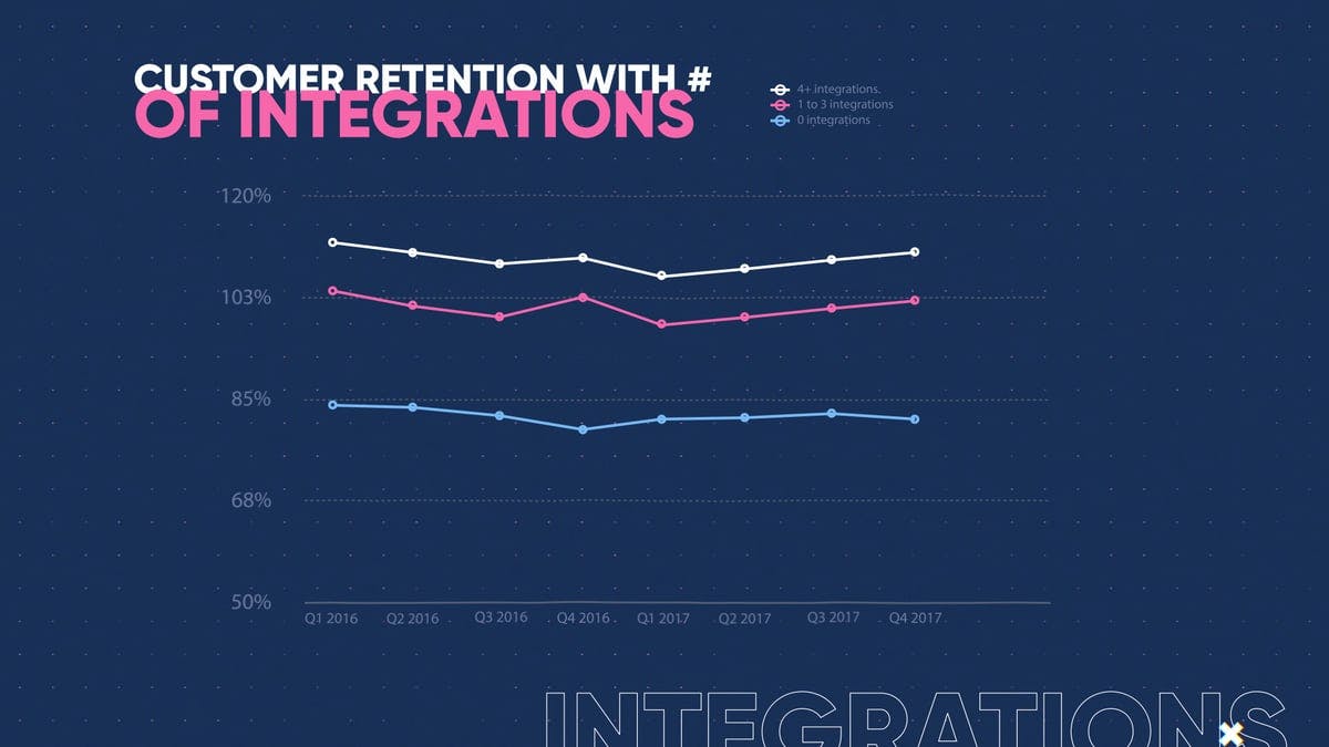 Oh yeah. Makes it so much stickier. Taking a look at the data here, what you're seeing is this lower end line here is basically the folks who have zero integrations, you're looking at overall net retention. Okay. So net revenue retention, we tracked it for, I believe it was a thousand and a half. So 15 to 1600 different subscription companies. Okay. And what we found is that those customers who essentially had zero integrations amongst these companies, their retention was almost 20% lower. Wow. Than those folks who had one to three integrations with the product or had more than three integrations with the product. It makes sense, right? If you have your products touching each other and kind of funneling data back and forth, then totally. It's gonna make for a much better experience. Yeah. And it's, I the, the direction of this didn't even really matter.
