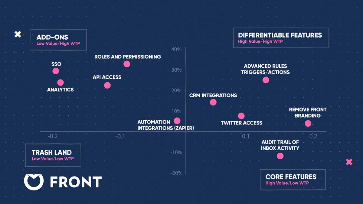 There is higher willingness to pay for some features, but it's still very low. Features like Audit Trail, Automation Integration with Zapier, Twitter access, and Remove Front branding have a plus or minus 10% impact on willingness to pay. These should just be included, or moved to lower tiers to avoid pushing customers up. Analytics and SSO roles and permissions could be add-ons, but it's okay to have them in premium tiers. Front needs to reconsider their pricing and packaging to avoid being punitive.