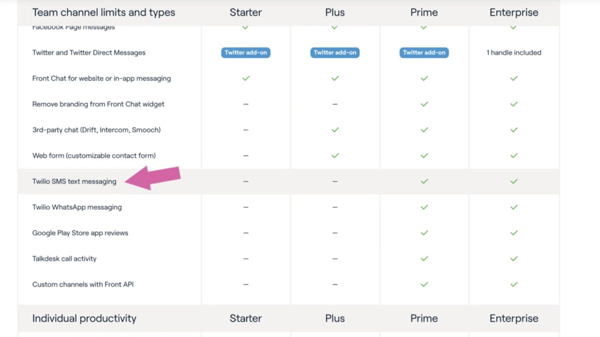 On Front's pricing page, SMS channels are only available in the Prime plan which costs $50 per user per month. This forces users who only need email, messenger, and maybe SMS to pay for unnecessary features and advanced rules, sometimes up to five times more than what they need. It would be better if Front offered SMS channels as an option in their main tier instead of only in the Prime plan.