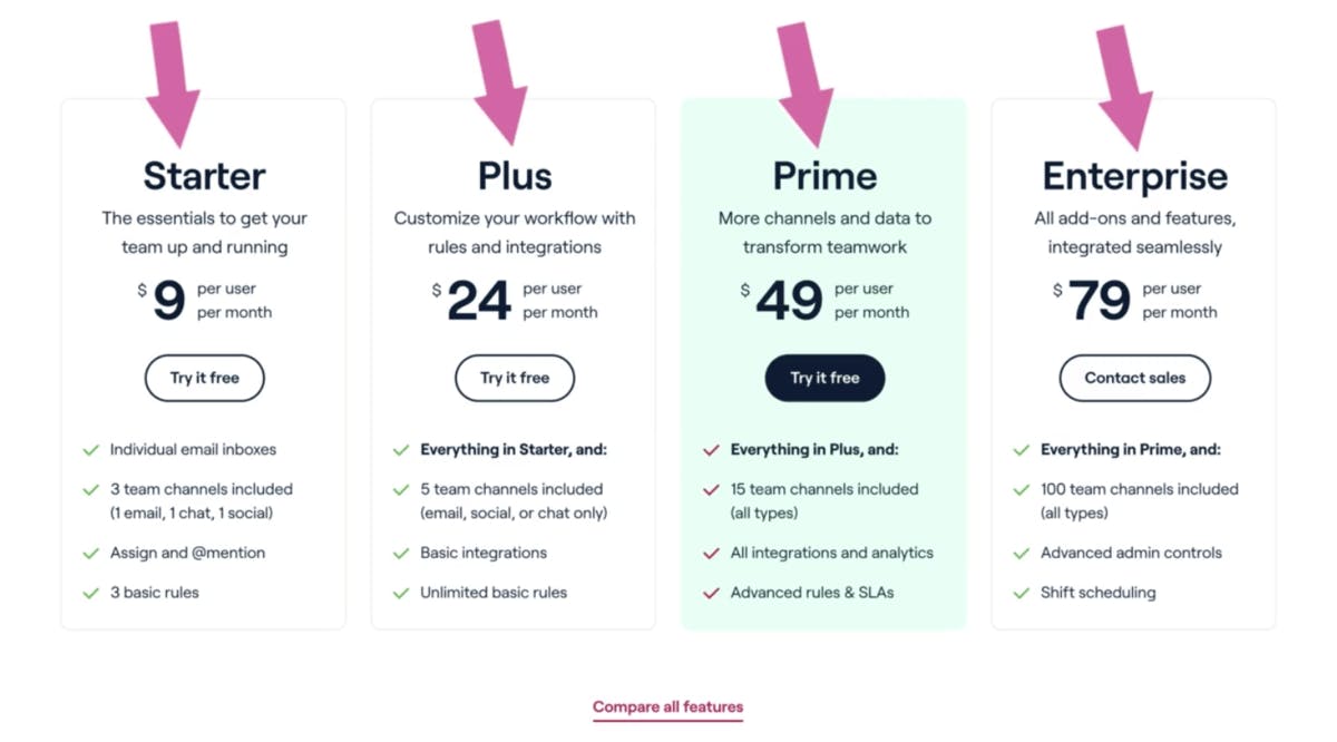 Okay. Cool. Overall great pricing page. Yep. At least in my opinion, I think there's two little tweaks that I would, I would kind of look at. Okay. The first tweak is, the one thing I do really, really well here is the starter plus prime enterprise. Some people do like Pond Lake. Oh shit. Shit plan, right? Which is like, it depends on your product. It's a little kitchy. I mean, this is great, these little callouts mm-hmm. <affirmative>. So the plus plan, customize your workflow with rules and integrations. Prime more channels and data to transform your teamwork. Those are very function based, right? And what we historically find is that these little callouts should be value prop and persona or segment based, right? Some identity, right? So great for small business, just getting started with a few inboxes, right? That's way too long. But like that, that helps contextualize where I should go because when I come to this page, really within five seconds, I should roughly know where I should explore more.