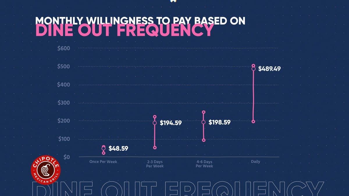 If you're a Chipotle fanatic, just search Chipotle on Twitter. Celebrities like David Dobrick and Scott Galloway talk about it all the time. Those who go daily are willing to pay a median price of $500. Even those who go multiple times a week are willing to pay up to $250. An unlimited membership or subscription with added perks could be a great opportunity. If just 10% of their base buys into it, they could make a profit with monthly payments of $350 or even $500.