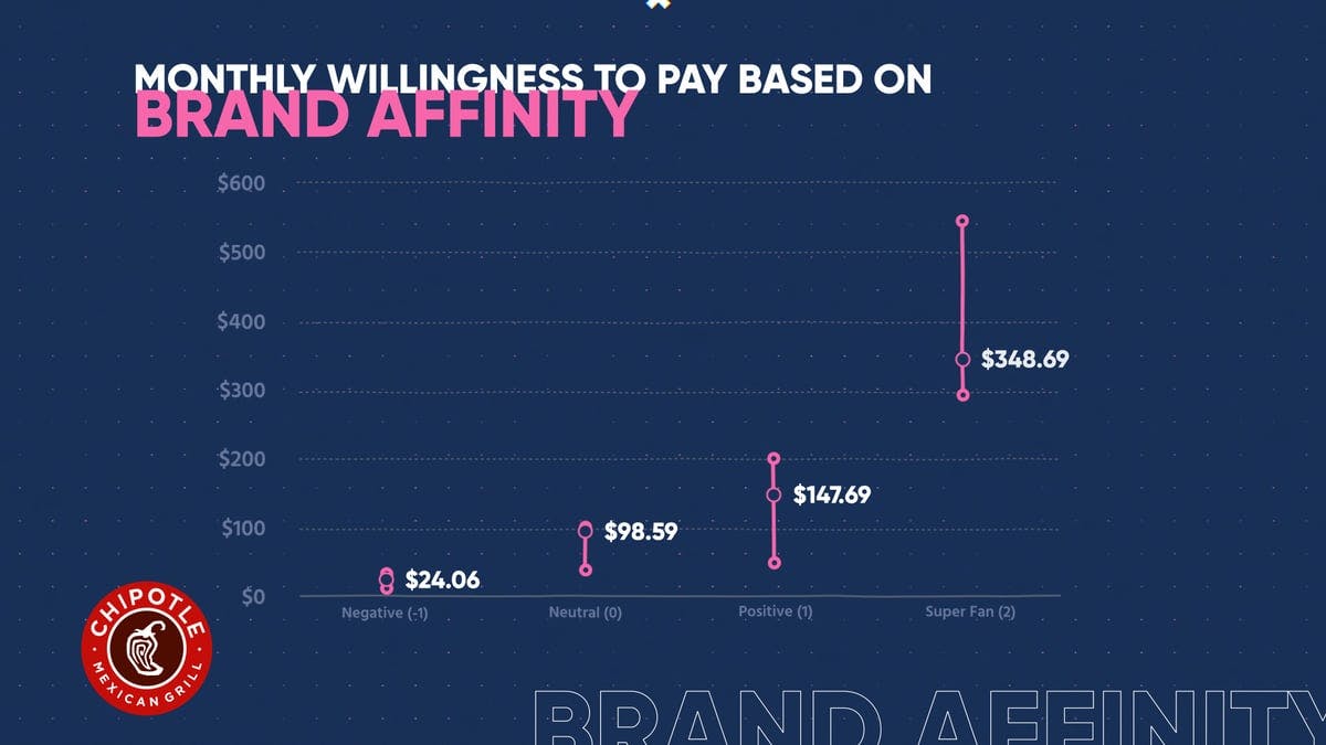 And we looked at it based on brand affinity, people who were kind of like negative, like they didn't like Chipotle, we still wanted to get their information. People are kind of neutral and we really care about the super fans here because the willingness to pay, at least when we just look at the superfans, the median is about 350 bucks a month, right? Yeah. And if you think about the average, you know, kind of Chipotle order is about $14, right? And an average burrito is about 10. You're talking about like 30 burritos in a month, which is basically one a day, right? Yeah. But not everyone's gonna use it every single day. Right. The other thing to kind of think about is look at the range. Look how high that it goes So high. Yeah. We're going over $500 a month. It's almost 600 for Chipotle subscription.