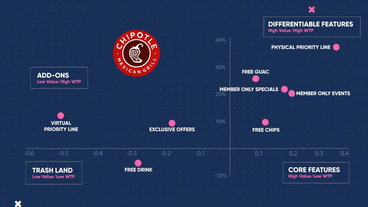 What's the number one problem with Chipotle or Sweet Green or any of these other products? Oh, the lines. The lines. And what we found when we looked at the value matrix here is that this physical priority line, basically making sure you can skip the line, had really, really high affinity. Meaning it was preferred over the other features and it had really, really high willingness to paper people cared about it. Yeah. But even more interesting member only events, member only specials, the beauty of a subscription is the relationship is baked into how you make money. These are the folks who got their unlimited card, they're gonna tweet about it, they're gonna tweet when they get Chipotle. Oh definitely. They're not only gonna help increase the margin, you throw 'em some member only events and all of a sudden what starts happening is you actually get more CAC implications, more lifetime value implications, more average order value implications.