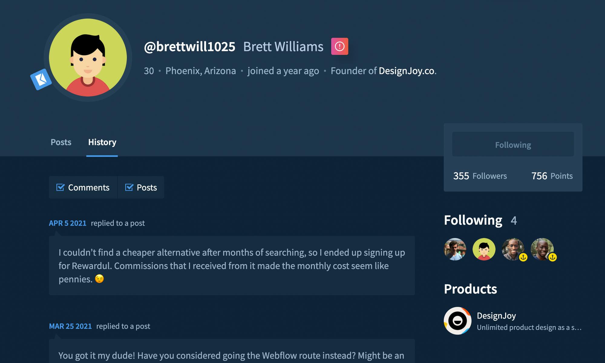 Brett shared his story on indiehackers.com, a well-known community for indie makers. What Brett didn't do was spam the community. Instead, he replied to questions, shared insights from his own journey, and created a narrative that people loved, as well as a service that people needed. In fact, Brett has posted 1000s of high-quality comments on the indiehackers community, which you can see here.