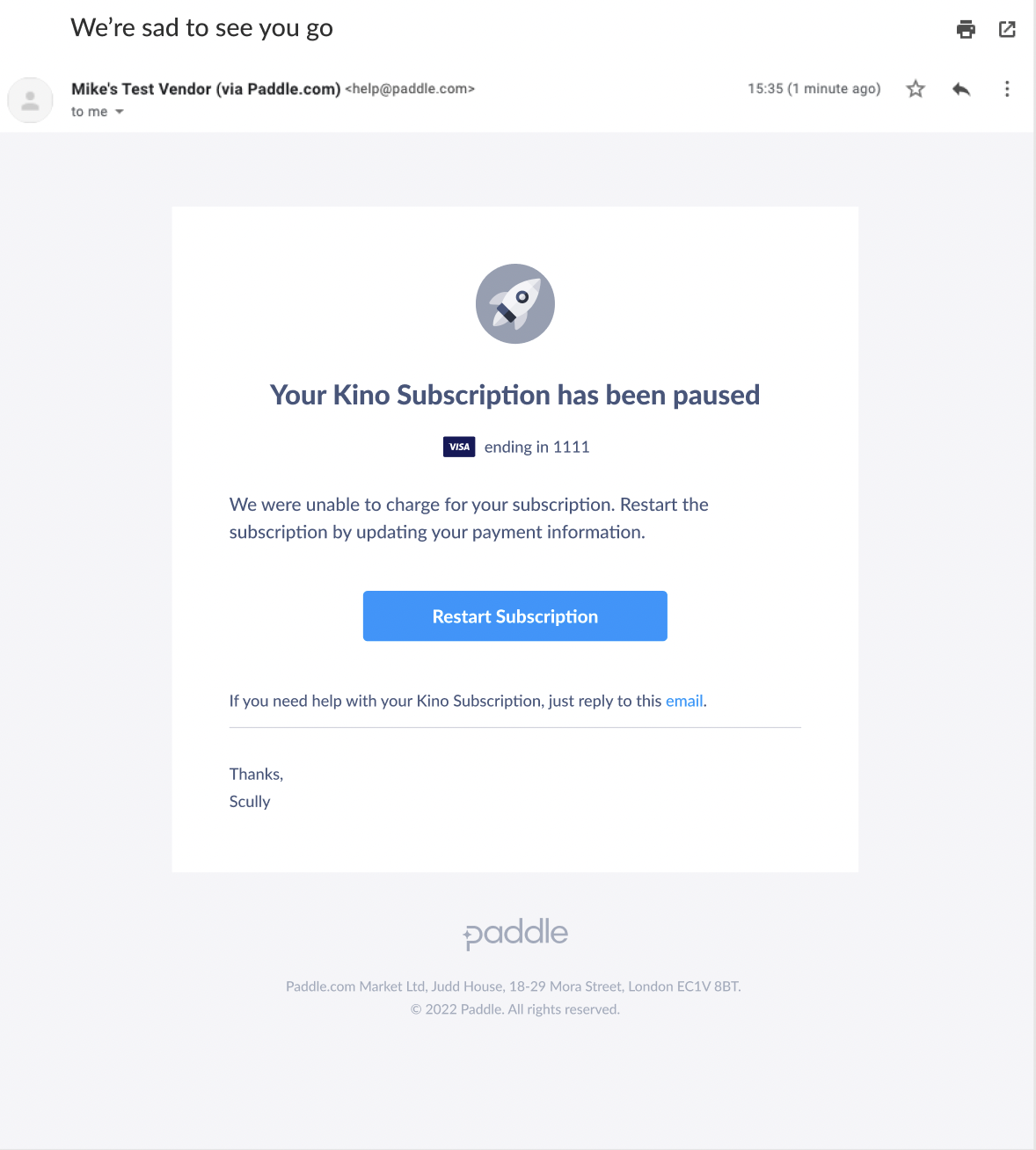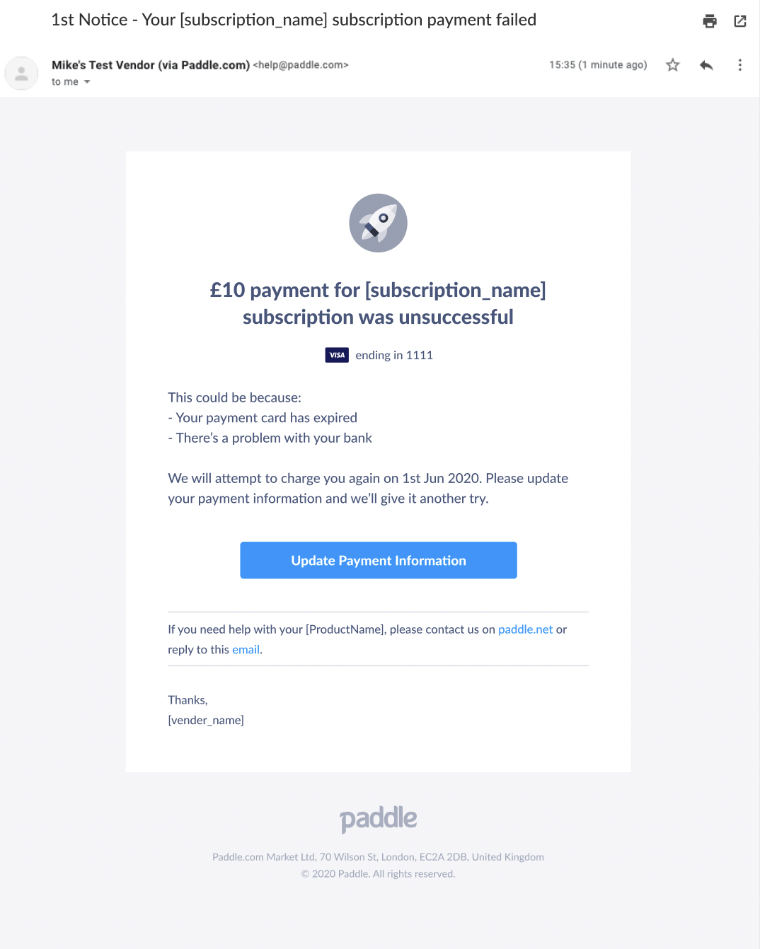 You’re able to switch on failed billing notifications for subscriptions (recommended) and specify how often we should retry the payment in the Recover Settings page of your Paddle dashboard. For each failed billing attempt, customers will receive the following notification: