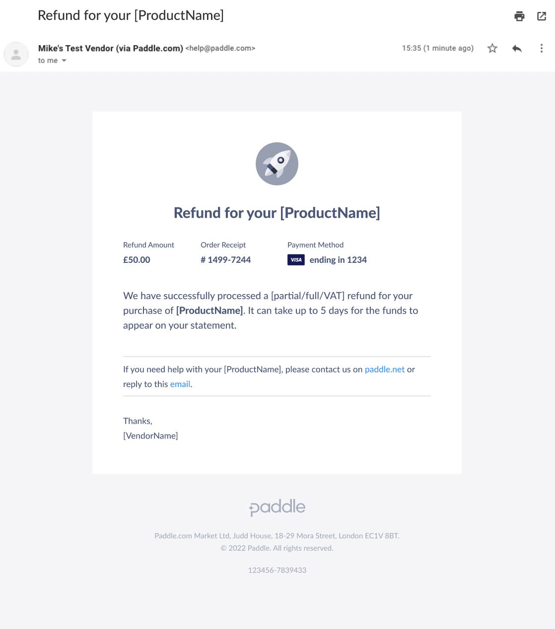You’re able to issue a full or partial refund from the order page on the Transactions page of your Paddle dashboard. Upon issuing a refund, customers will receive the following email notification: