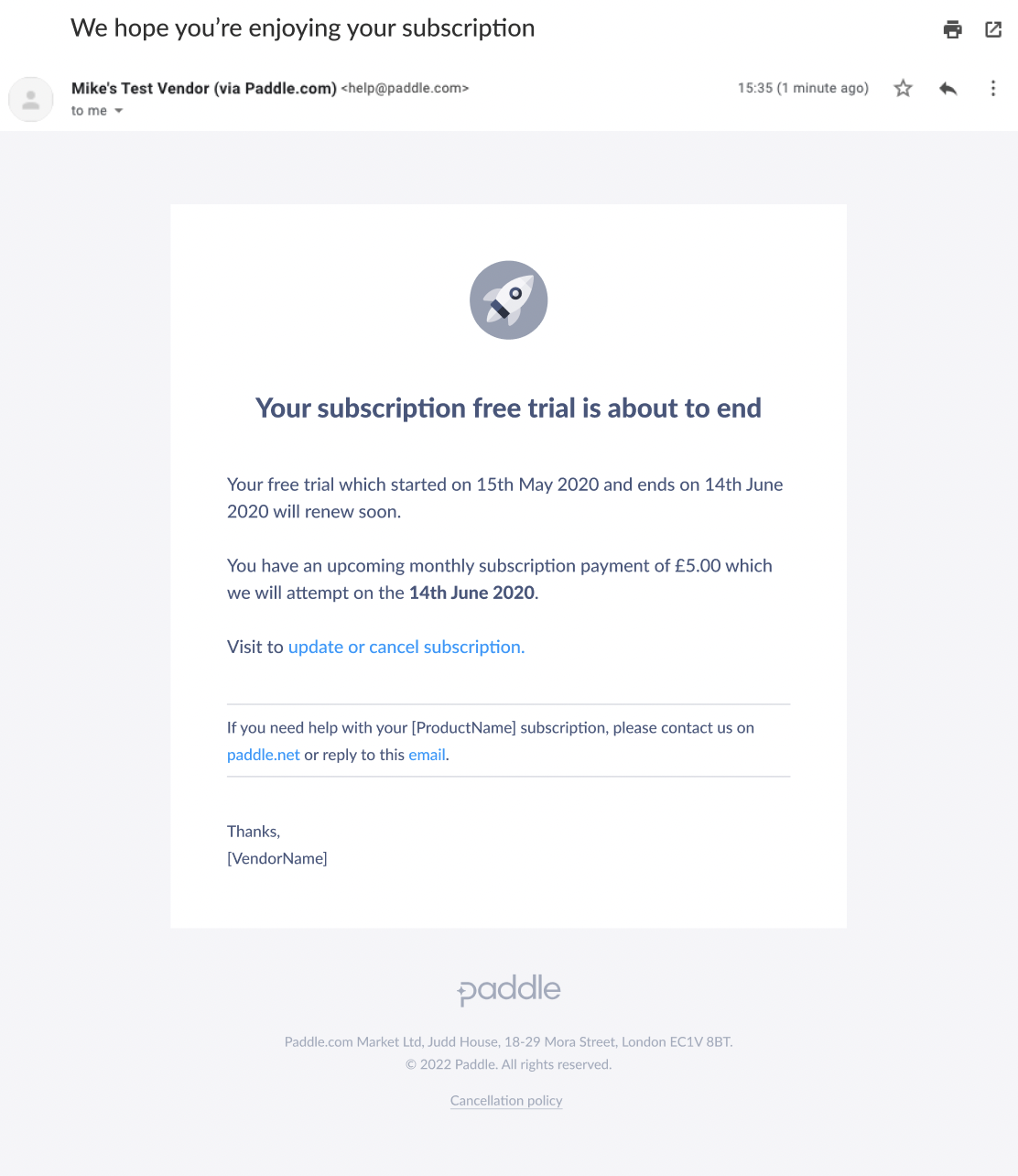 You’re able to switch on pre-billing notifications for subscriptions and specify the number of days before the next billing date in which they are delivered in the Recover Settings page of your Paddle dashboard. For each pre-billing reminder, customers will be sent the following email notification: