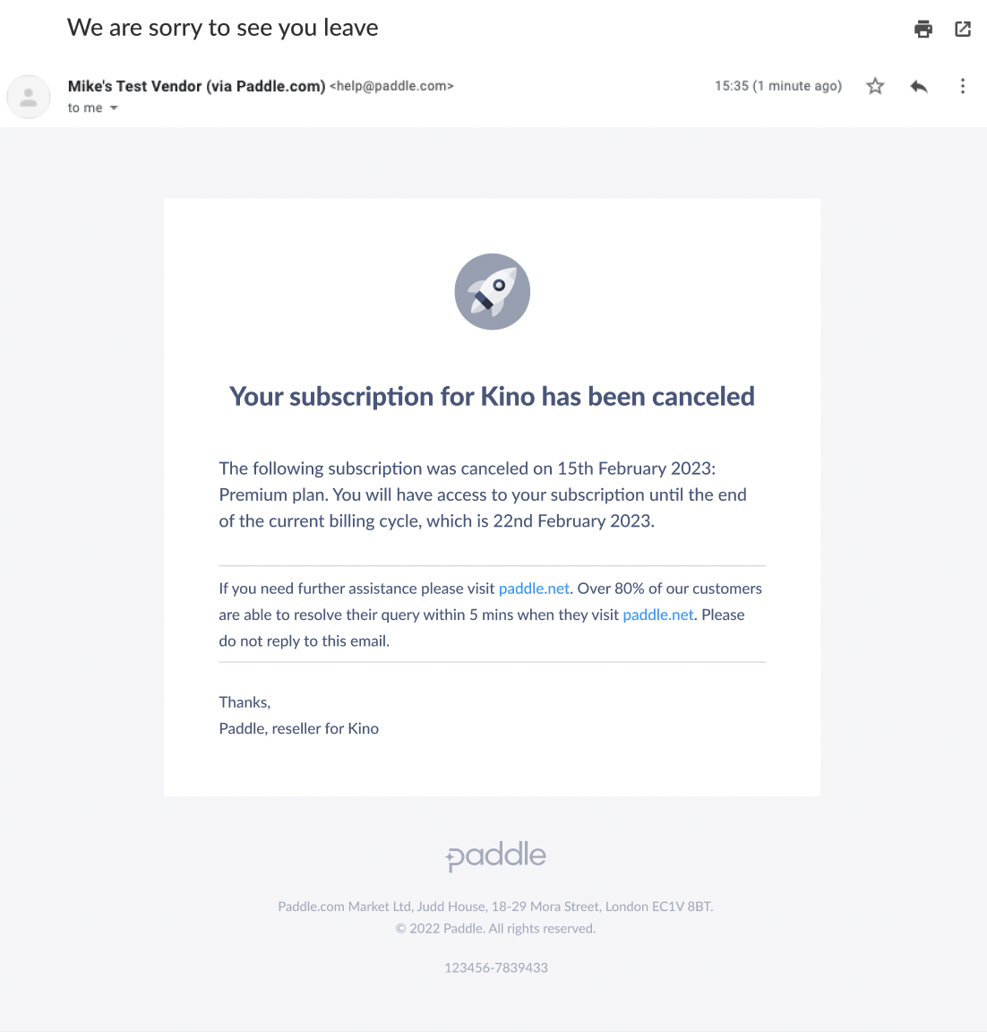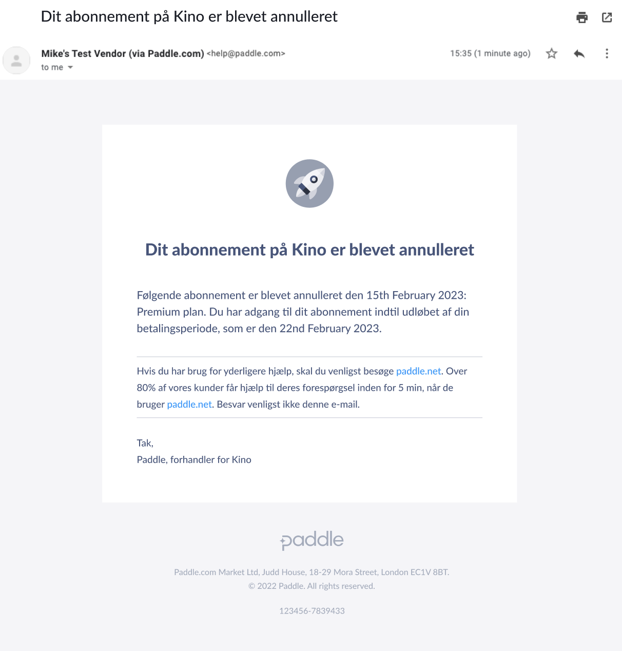 Paddle automatically translates these emails into the 16 languages currently supported in the Checkout: English, French, Portuguese, German, Spanish, Russian, Japanese, Italian, Polish, Dutch, Arabic, Chinese (simplified), Korean, Swedish, Danish, and Norwegian. This means customers will receive all transactional emails in the language they checkout in, which can help decrease involuntary churn and boost conversions in the post-purchase journey*. Here is an example of a Cancelation Notification in Danish: