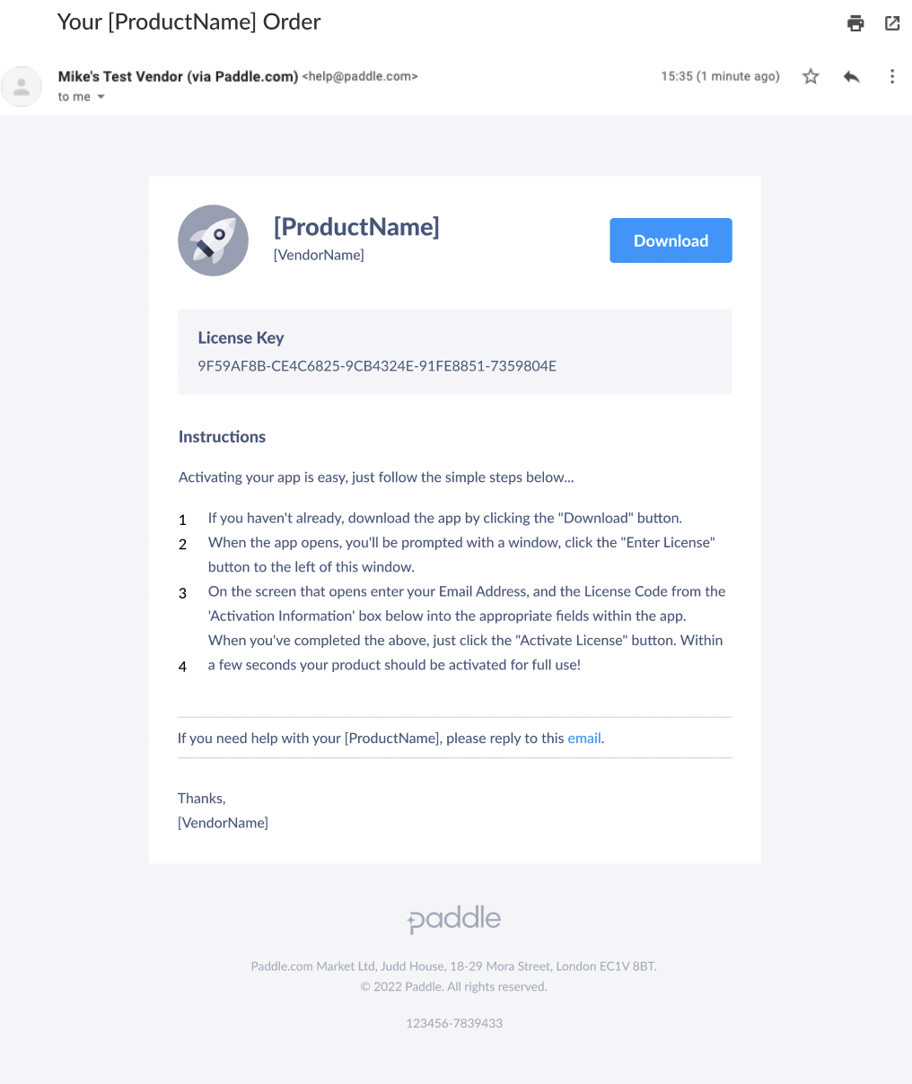 Once the payment is processed, customers receive the following email detailing how they can activate and start using your product: