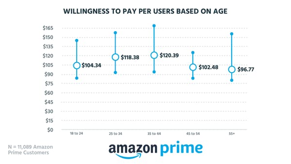 Willingness to pay for different age brackets of Amazon Prime customers.