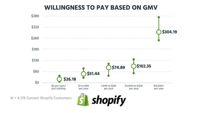Ecommerce store provider Shopify is one of the companies we found that did the best job of pricing for their customer's WTP. They offer a $29 basic, $79 premium, and $299 enterprise tier for customers. When we break down WTP based on gross merchant volume (the number of sales they made in one year), they're right in line with the data.