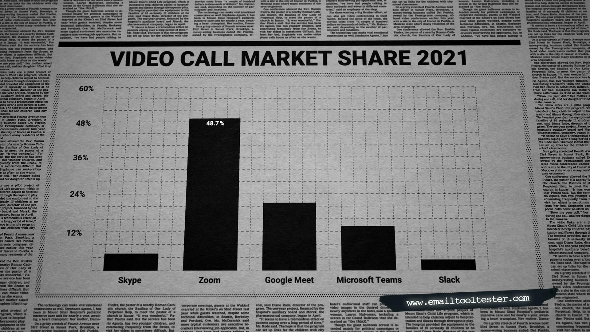 In 2020, a global pandemic swept over, and life as we knew it, seemed to change overnight. Suspended travel, at-home schooling, and working from home all became standard. And most major video conferencing companies benefited. Well… some more than others. Zoom saw its market share go from 26.4% in 2020 to 48.7% in 2021, more than twice the market share of Skype and Microsoft Teams combined.